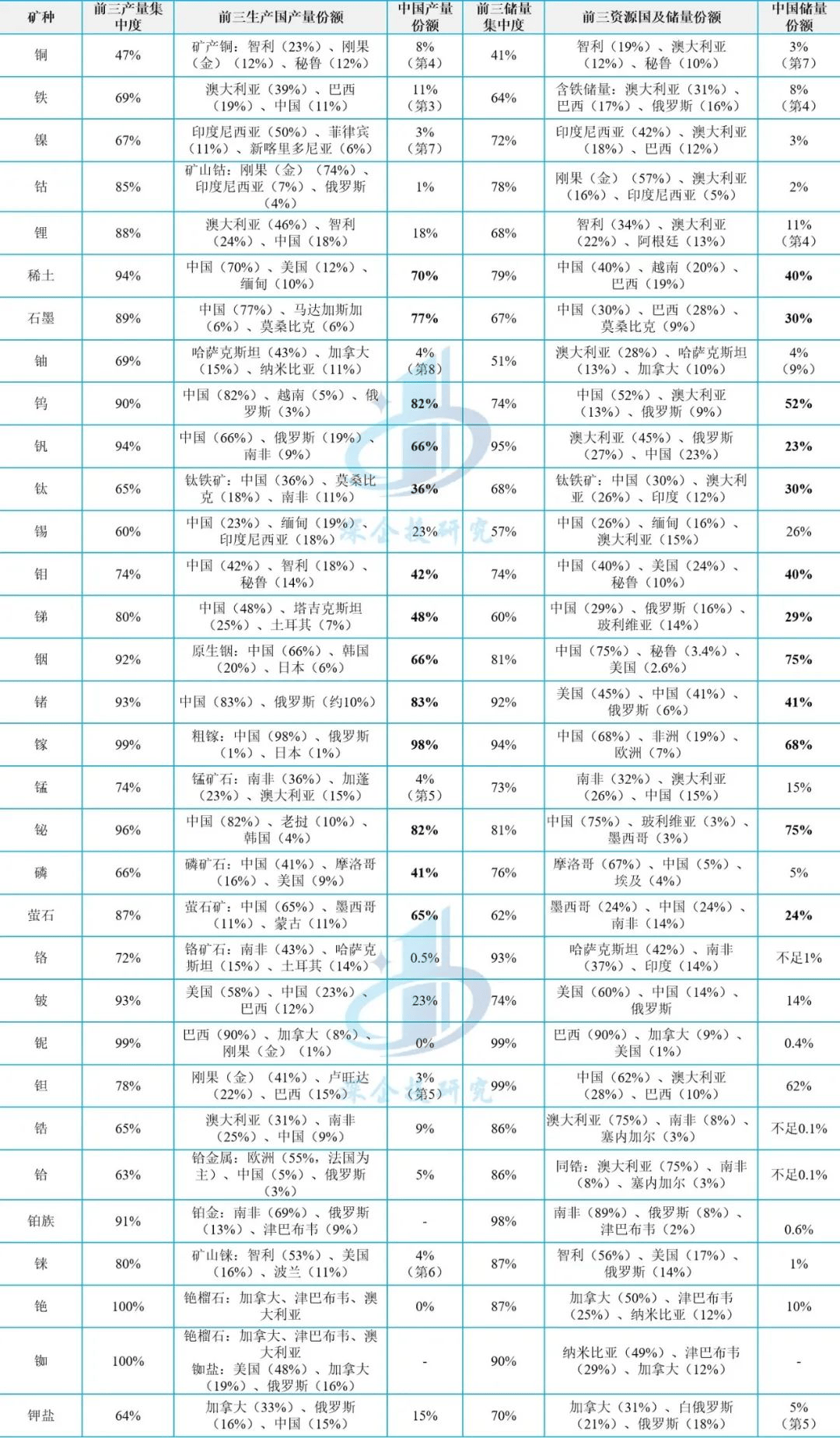 跟着全球数字经济、洁净能源(核电、风电、光伏、储能、氢能)、电动汽车财产迅猛成长,相关的原料、矿产主要性凸显,特别是洁净能源上逛矿产普遍进入环节矿产范畴之中。国际能源署(IEA)指出洁净能源普遍利用的沉点矿物包罗钴、铜、锂、镍、稀土元素(包罗钕、镝、镨、铽、钪、钇等17种金属元素),其他矿物包罗砷、硼、镉、铬、镓、锗、石墨、铪、铟、铱、铅、镁、锰、钼、铌、铂、硒、硅、银、钽、碲、锡、钛、钨、钒、锌、锆。洁净能源环节矿产需求迅猛增加。按照国际能源署(IEA)正在2022年的预测,若要正在2050年实现全球碳中和的方针,全球能源转型程序需要进一步加速,可再生能源行业将成为锂、镍、钴、铜、稀土元素的最大消费部分,估计2040年全球环节矿产需求将比2020年增加6倍多,此中锂需求将增加40多倍,石墨、钴和镍的需求约增加20~25倍,铜的需求将会加倍,电动汽车和储能电池的金属需求正在2040年将会至多添加30倍。环节矿产次要分布正在少数资本富集的国度。环节矿产的全球分布极不服均,富集于少少数国度。大型矿产投资周期长,从勘察、扶植到投入利用凡是需要十余年时间,矿物供给增加迟缓。矿产分布不均、供应欠缺导致环节矿产的计谋主要性凸显,矿产资本国正在全球矿产供应链中的影响力和话语权显著提拔,激发资本国新一轮资本平易近族从义以及次要经济体之间财产链节制力抢夺。以次要环节矿产的储量和产量(原生金属)份额集中度为例,前三国度储量占比(CR3)达到或跨越80%的环节矿产10余种,包罗稀土(约80%)、钒(95%)、铟(81%)、锗(92%)、镓(94%)、铋(81%)、铬(93%)、铌(99%)、钽(99%)、锆(86%)、铪(86%)、铂族(98%)、铼(87%)、铯(87%)、铷(90%)等;产量CR3达到或跨越80%的环节矿产约20种,包罗钴(85%)、锂(88%)、稀土(94%)、石墨(89%)、钨(90%)、钒(94%)、锑(80%)、铟(90%)、锗(93%)、镓(99%)、铋(96%)、萤石(87%)、铍(93%)、铌(98%)、铂族(91%)、铼(80%)、铯(100%)、铷(100%)等。做为大商品的环节矿产中,铜、铁、镍、铬、锰、锡等分布也较为集中。铜的储量和产量CR3别离为41%、47%,铁的储量和产量CR3别离为64%、69%,镍的储量和产量CR3别离为72%、67%,铬的储量和产量CR3别离为93%、72%,锰的储量和产量CR3别离为73%、74%,锡的储量和产量CR3别离为57%、60%。